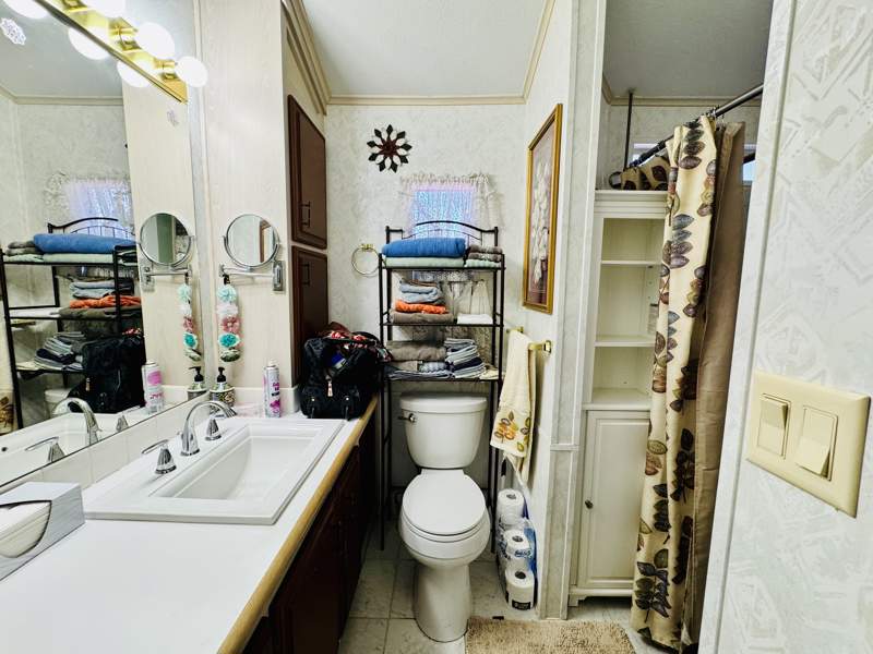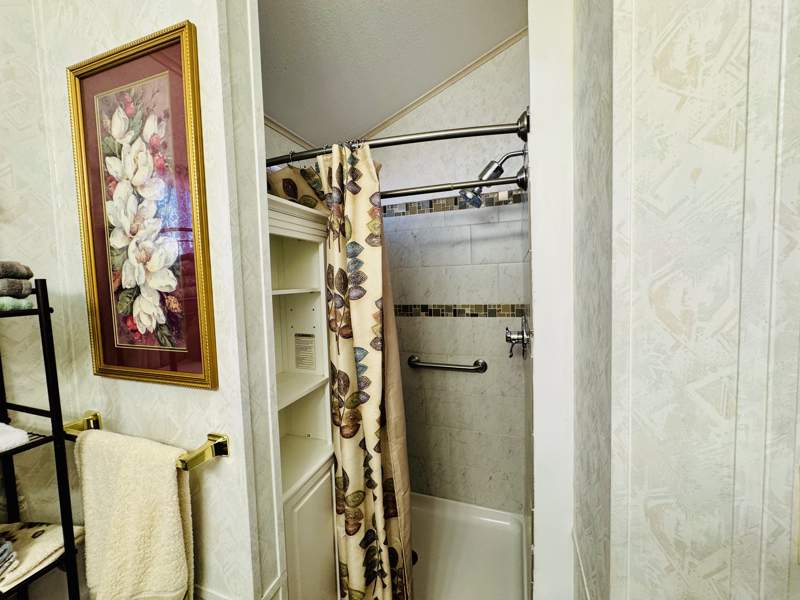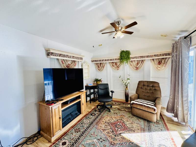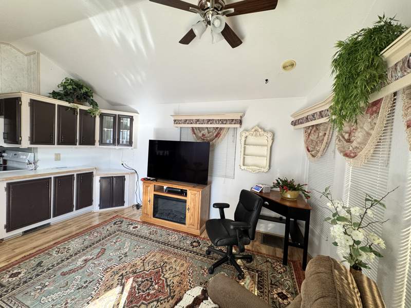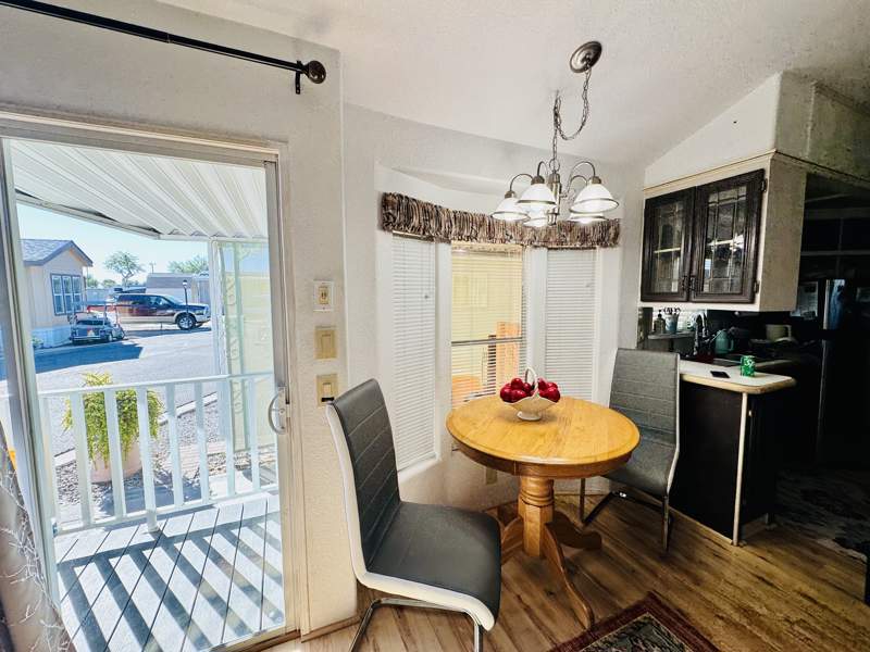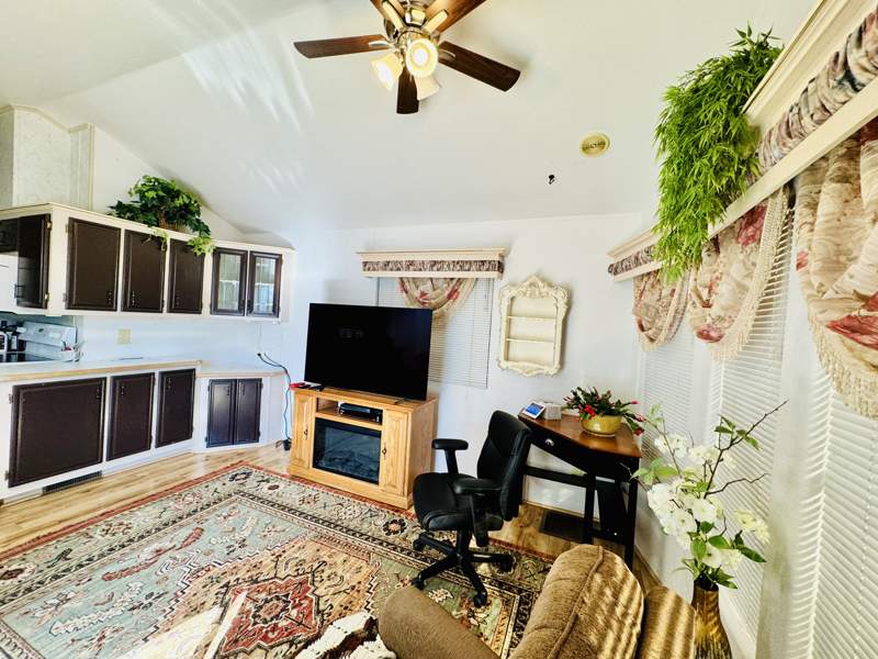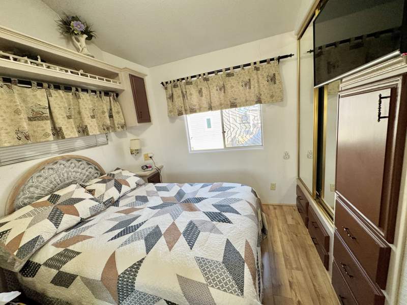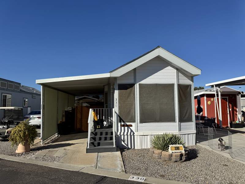 This charming 408 square foot Park Model home in Del Pueblo RV Resort boasts 1.0 bedroom and 1.0 bathroom, offering a cozy and efficient living space. Built in 1997 by Chariot Eagle, the home features a spacious living room perfect for entertaining guests, a comfortable master bedroom for relaxation, and a fully-equipped kitchen with modern appliances such as an oven, fridge, microwave, washer, and dryer. The exterior of the home includes a convenient carport for parking, as well as a shed for storage, while the interior boasts amenities like a hot water heater, central A/C, and a soft water system for added comfort.