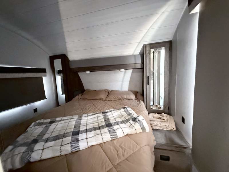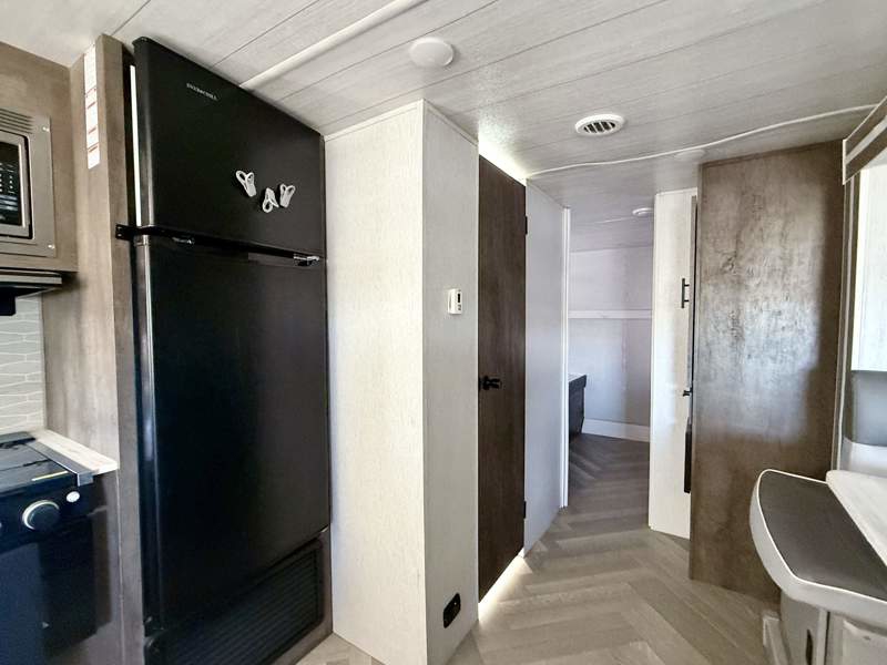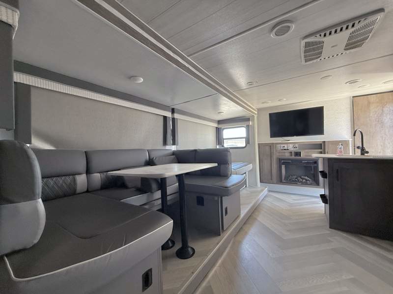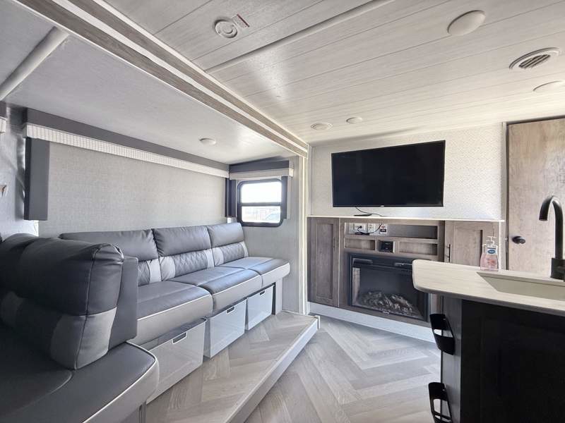 The 2022 Forest River travel trailer at Del Pueblo RV Resort is a cozy retreat. The open floor plan includes a spacious living room, dining area, compact kitchen, and a comfortable master bedroom. The interior features modern appliances such as an oven and fridge, making meal preparation a breeze. With stylish decor and efficient use of space, this travel trailer offers a comfortable living experience for individuals or couples looking to enjoy the RV lifestyle in Yuma, AZ. Enjoy free space rent for a year.