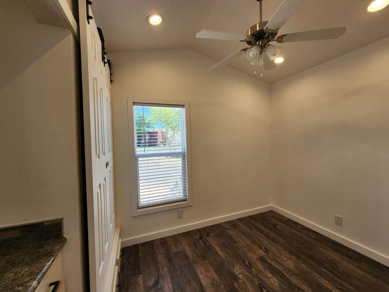 Step into luxury in the bathroom, where a walk-in shower with benches awaits, providing a rejuvenating escape. The bedroom is a retreat designed with your convenience in mind. Modern barn doors lead to a generously sized closet with six storage drawers, ensuring your wardrobe is impeccably organized. Create your entertainment haven with a dedicated TV nook, perfect for cozy nights in.