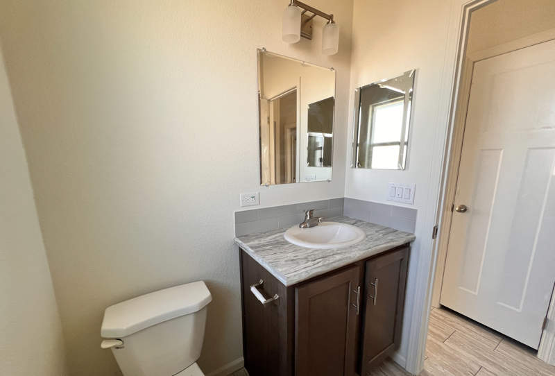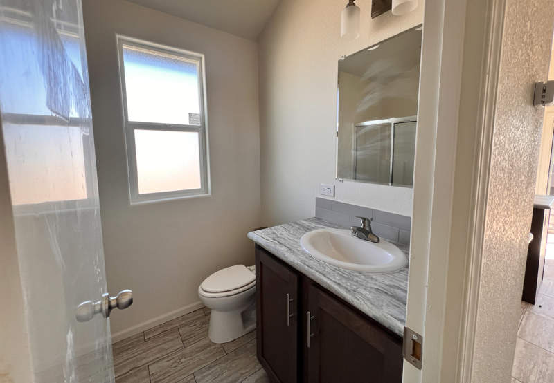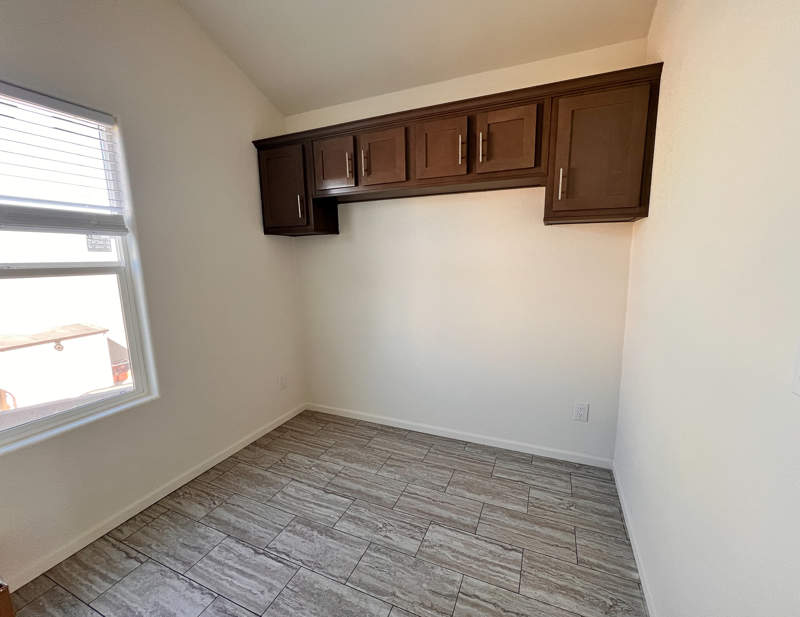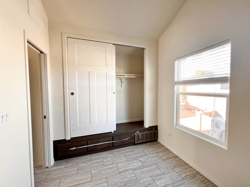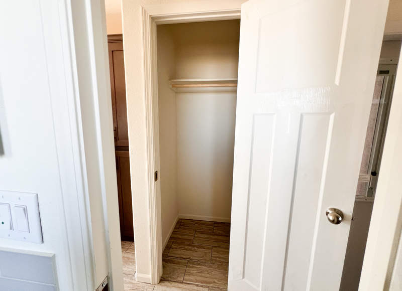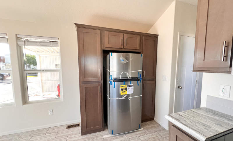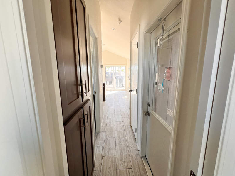 A generously sized shower awaits in the bathroom encased in sleek glass doors. You'll spend restful nights in the serene bedroom, with a large closet and convenient above-bed storage where organization meets style. Thanks to the hall pantry and a large additional closet, storage won't be a concern in this park model! If you choose, the hall closet is large enough to fit a stackable washer/dryer once the hookups are added. Whether you're stowing away seasonal items or keeping daily essentials close at hand, you'll appreciate the extra space designed for your convenience.
