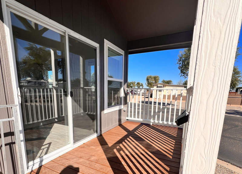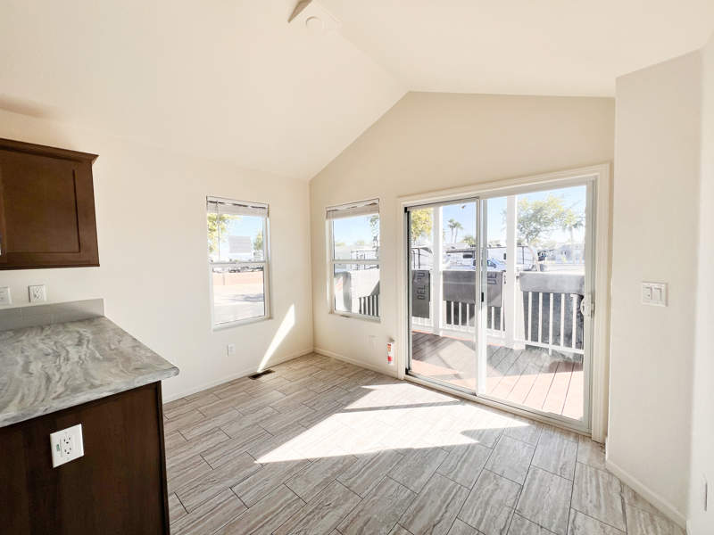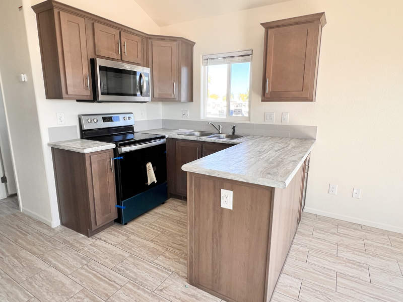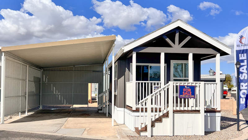 This exquisite brand-new park model is on a corner lot and has an extra large carport not available anywhere else in the park! Enter from the front porch into the living room, where relaxation takes center stage with space to unwind and entertain. The kitchen features a thoughtful layout with abundant cabinets where you can easily prepare meals, surrounded by the amenities that make cooking a pleasure.