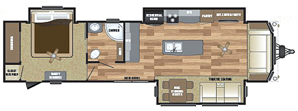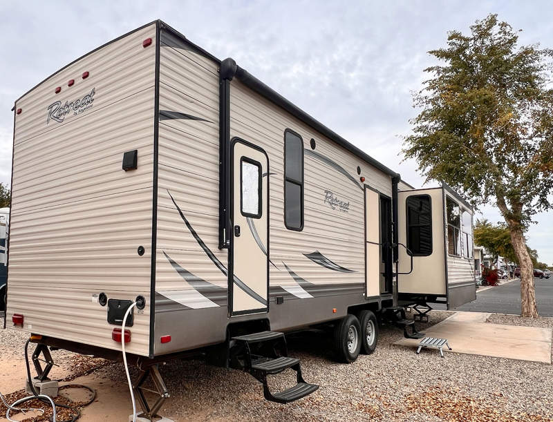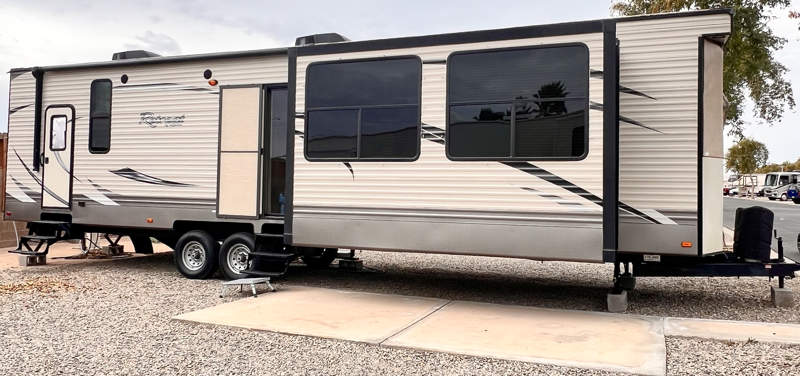 This travel trailer home at Del Pueblo RV Resort in Yuma, AZ, offers a cozy living space with 1 bedroom and 1 bathroom. This RV features a spacious living room, dining room, and a well-equipped kitchen with an oven, fridge, and microwave. The master bedroom provides a comfortable retreat, while the central A/C and hot water heater ensure a pleasant living environment year-round.