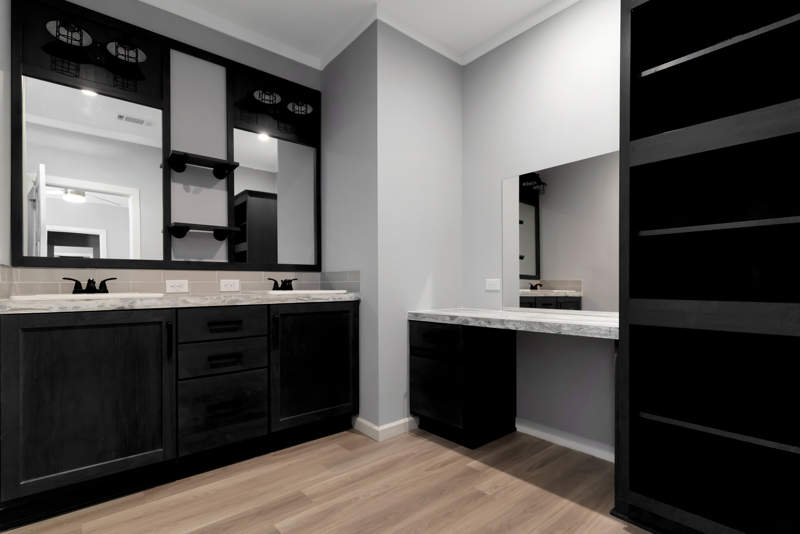 Attached Master Bath with Double Rectangle Sinks and Floating Shelves
