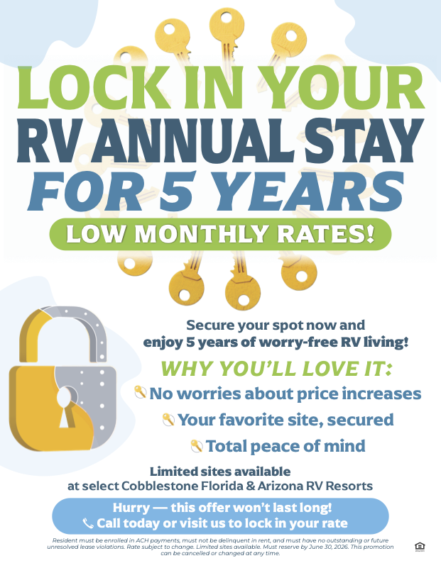 *Resident must be enrolled in ACH payments, must not be delinquent in rent, and must have no outstanding or future unresolved lease violations. Rate subject to change. Limited sites available. Must reserve by June 30, 2026. This promotion can be cancelled or changed at any time.
