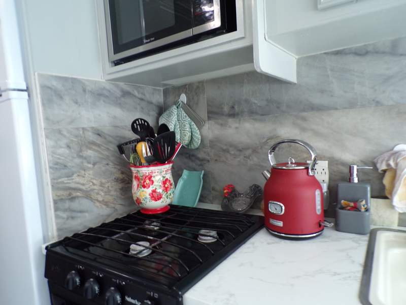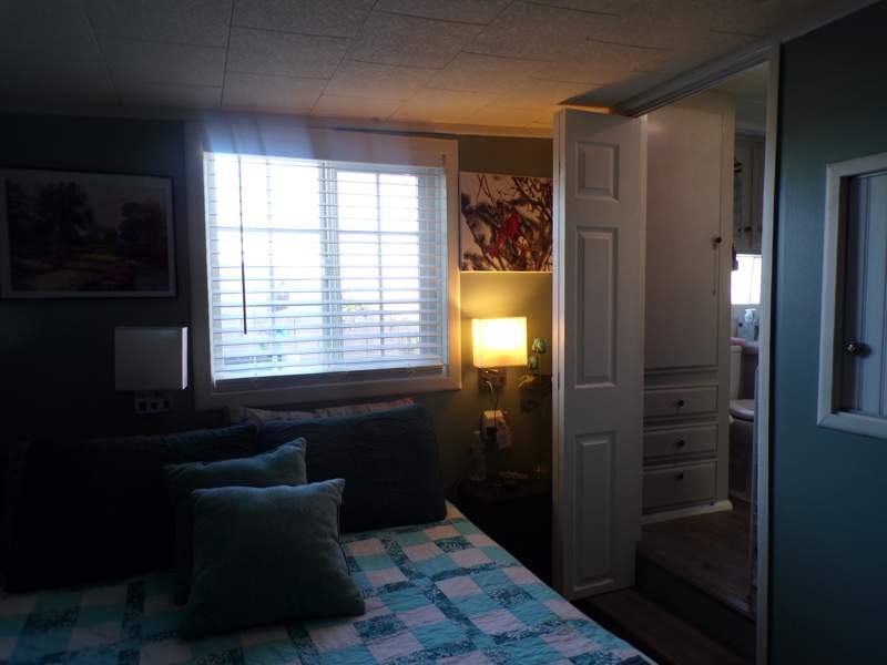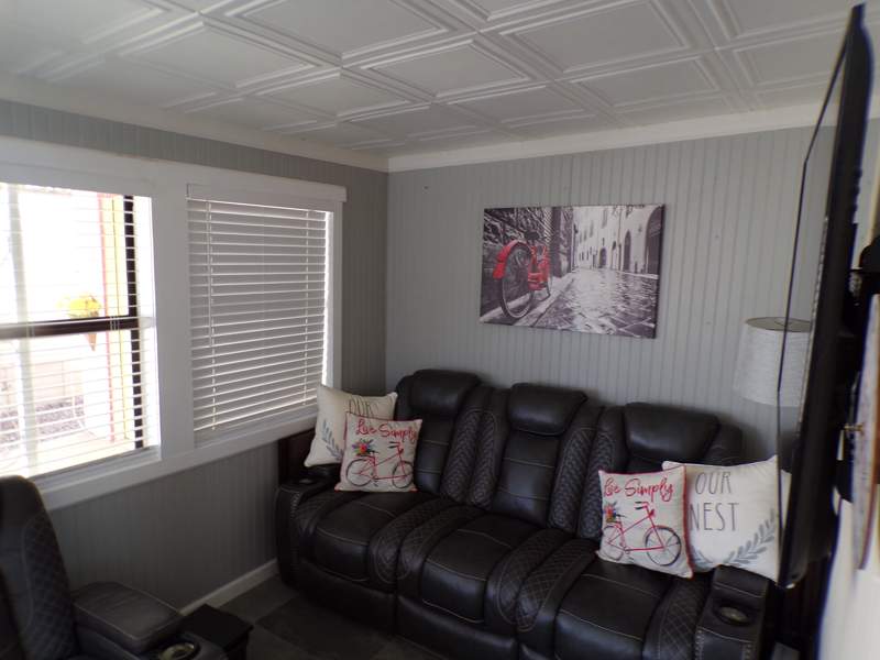 This Park Model home in Coolidge, AZ, located in the Indian Skies community, was built in 1985. The existing trailer has been renovated in 2022 looking more like a tiny home.The charming home features 1 bedroom and 1 bathroom, making it perfect for a single person or couple looking to downsize. The living room, dining room, family room, and well-equipped kitchen, all new flooring, panelling, windows and trim, blinds, cabinets, backsplash, countertops, ceiling tile throughout. The bedroom has been converted into a relaxing sitting room with slide out bed that sleeps 2 with double mattress. Addition boasts of 8x16 queen bed all bedding included, lots of storage with wardrobe, dresser and closet. The bathroom is painted with light color to enhance its size,lots of storage for towels, bedding, new toliet, sink & tub. 8x16 living area beautifull renovated living area with new blinds, flooring, panelling, window casting, trim makes for a relaxing evening with power set sofa set, electric fireplace on those cool nights. This home offer plenty of space for comfortable living. Exterior features of the home include a carport, shed with washer and dryer, and patio, providing additional storage and outdoor living space.