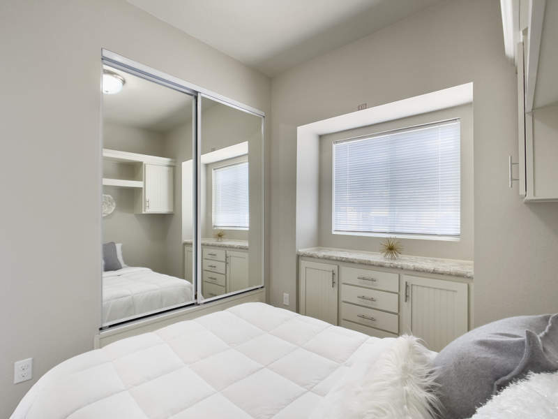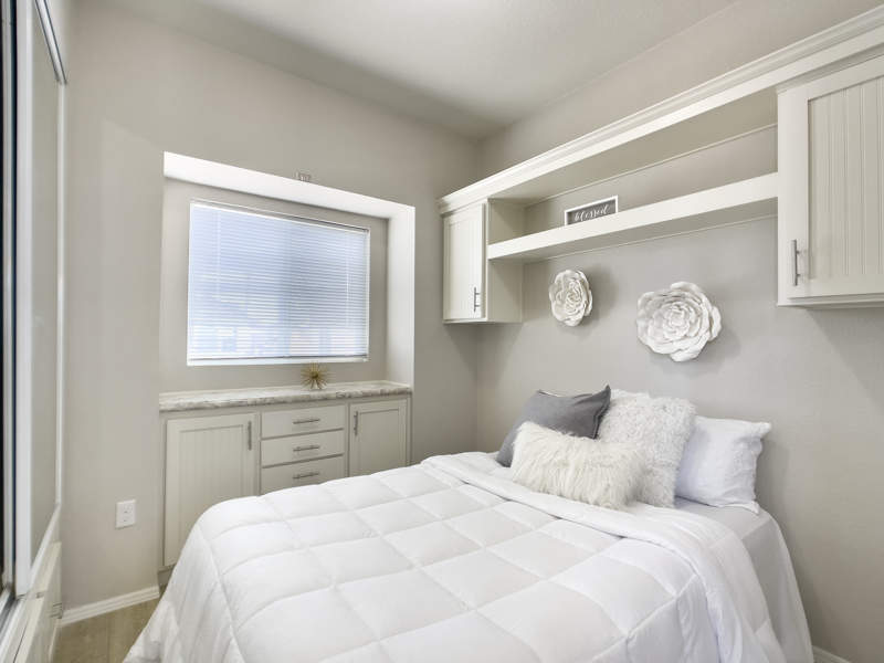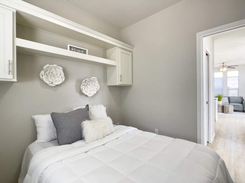 This beautiful home is a soft bluish green color with a nice white trim and boasts several windows throughout that bring in plenty of light. This home features open concept Living Room, Dining area and Kitchen with light white cupboards in the Kitchen, Bathroom and Bedroom. The Bedroom has a large built-in dresser and extra cupboards for all your clothing needs.