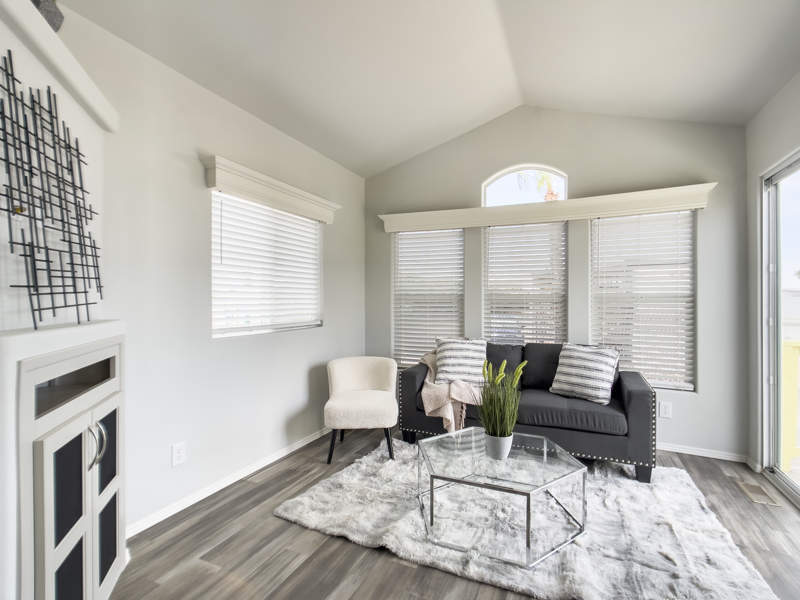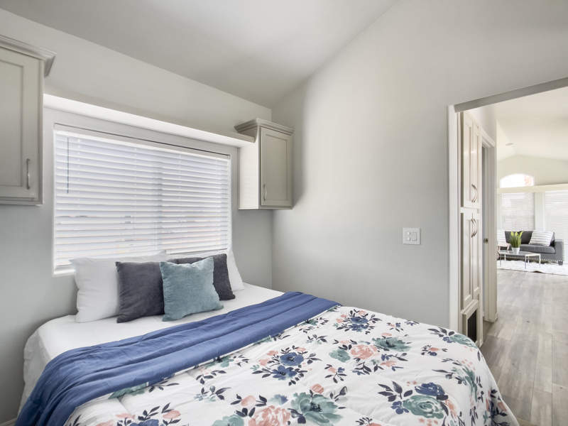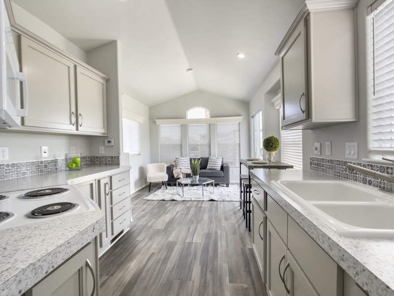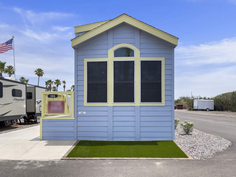 The charming 2021 1 BR/1 BTH Cavco Oak Springs Park Model home sits on a nice sized corner lot.