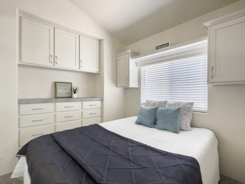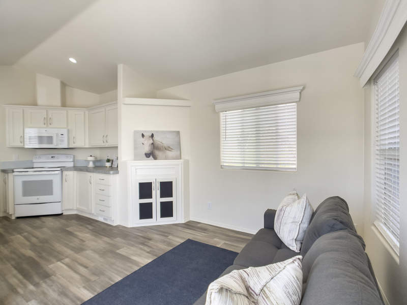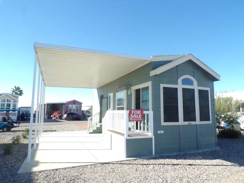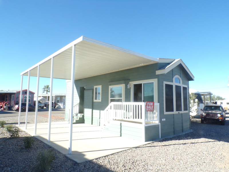 The charming 2021 1 BR/1 BTH Cavco Oak Springs Park Model home sits on a very large lot with a huge patio.