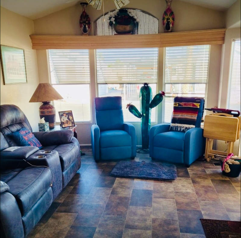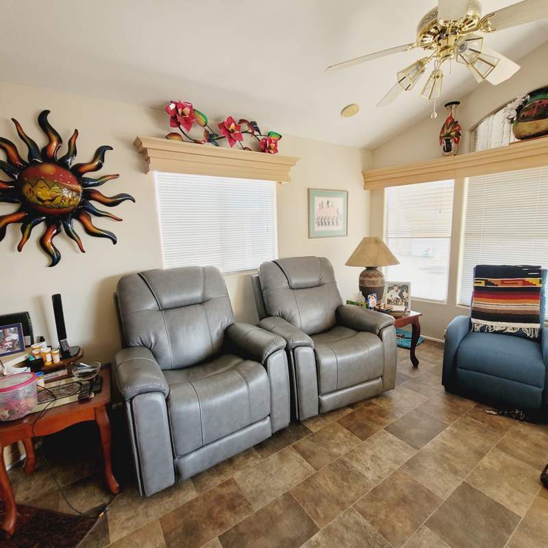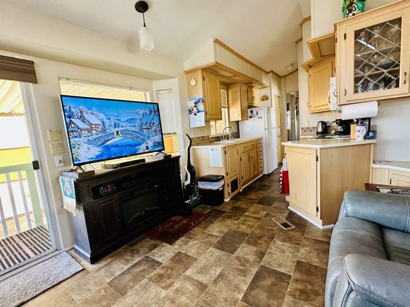 This quaint 385 square feet Park Model home in Las Quintas offers cozy living for individuals looking to downsize or snowbirds looking for a winter retreat. Built in 2000 by Cavco, this home features a functional layout with a spacious living area, a fully equipped kitchen with modern appliances, a comfortable bedroom, and a sleek bathroom. The home is tastefully decorated with neutral colors and large windows that allow natural light to fill the space, creating a warm and inviting atmosphere. Additionally, the home boasts a small outdoor patio perfect for enjoying the sunny Yuma weather.
