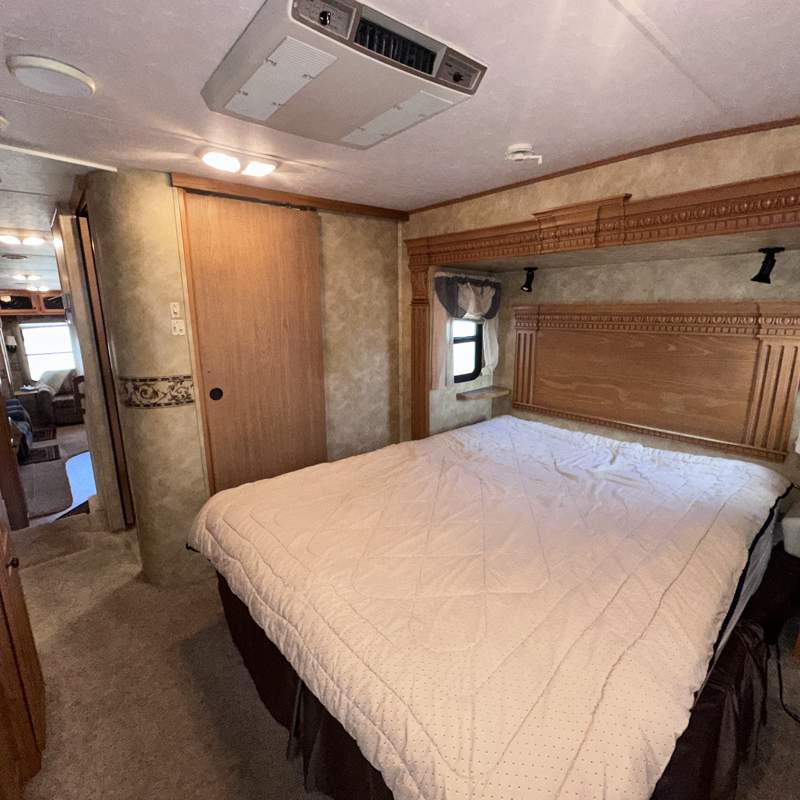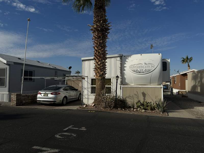 This charming 300 square foot Fifth Wheel home at Las Quintas in Yuma, AZ, is the ideal compact living space for a single person or couple. Built in 2009 this home features one bedroom and one bathroom, providing all the essential amenities in a cozy, efficient layout. The interior is tastefully designed with modern finishes and ample natural light, creating a welcoming and comfortable atmosphere. The kitchen is equipped with updated appliances and plenty of storage space, making meal preparation a breeze. The bedroom offers a peaceful retreat with enough space for a queen-sized bed and a spacious closet for all your belongings. The bathroom includes a shower, sink, and toilet, ensuring convenience and functionality. There has been a Sun Room built on adding additional areas for relaxation and entertaining.