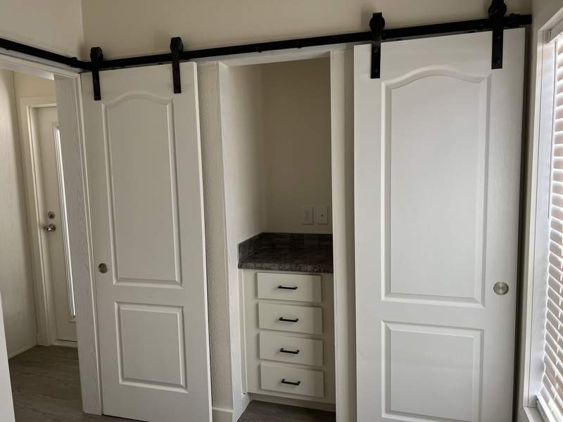The 468 square feet, 1.0 bed 1.0 bath Park Model home at Las Quintas in Yuma, AZ, built in 2023 offers a cozy and efficient living space. Featuring an upgraded kitchen with a stainless steel farm house sink, disposal, dishwasher, and a full size side-by-side fridge! Shed included.