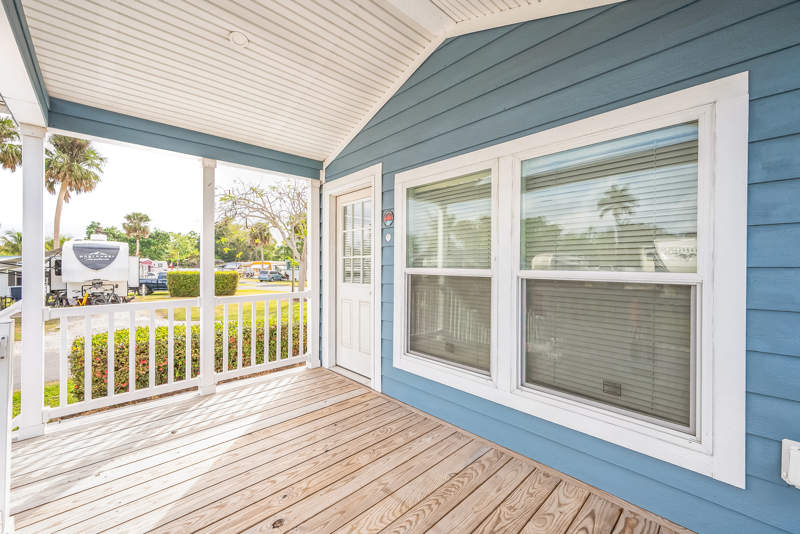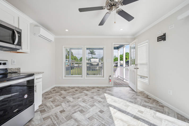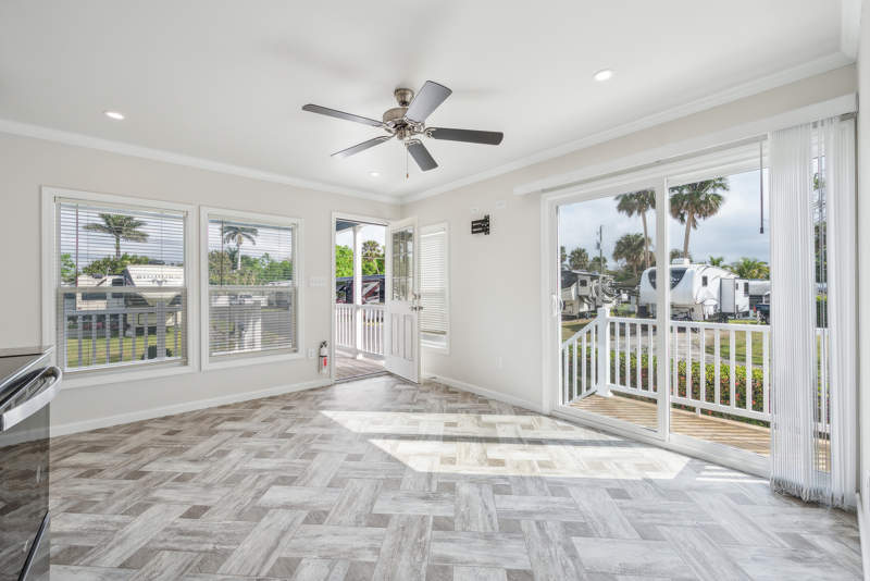 This cozy 1-bedroom, 1-bath Park Model home offers a perfect blend of comfort and style. Located on a corner lot, this home features a spacious living room ideal for entertaining or unwinding after a busy day. The exterior boasts a deck and covered porch, perfect for enjoying the beautiful Florida weather and relaxing outdoors. With durable vinyl siding, this home combines low maintenance with curb appeal and privacy.