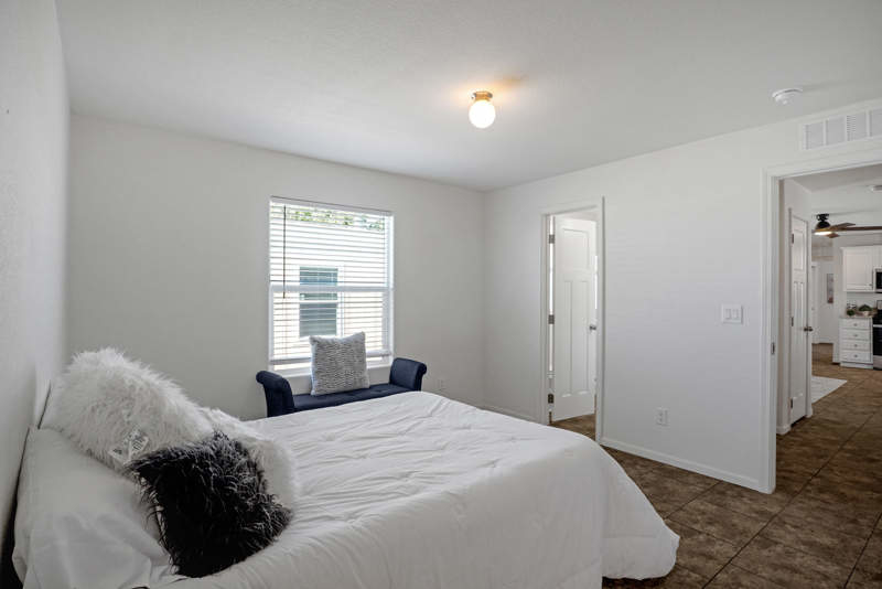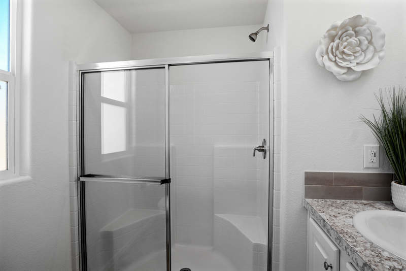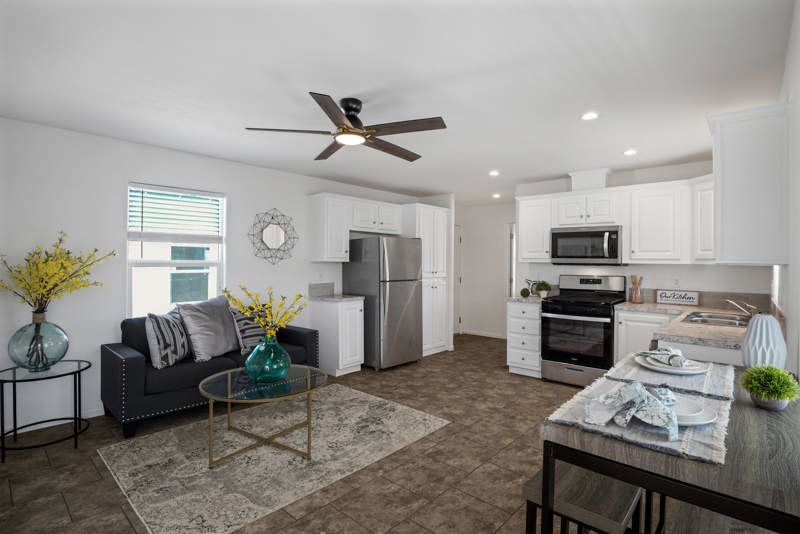 This 832 square foot manufactured home in Terra Vista community offers a cozy and modern living space with 2 bedrooms and 2 full bathrooms. The interior features a spacious master bedroom with an en suite bathroom, a great room perfect for entertaining guests, and a kitchen equipped with stainless steel appliances such as an oven, fridge, dishwasher, microwave, and garbage disposal. The home also includes a convenient washer/dryer hook up, central air conditioning, and a hot water heater for added comfort. Outside, there is a carport for parking and outdoor storage.