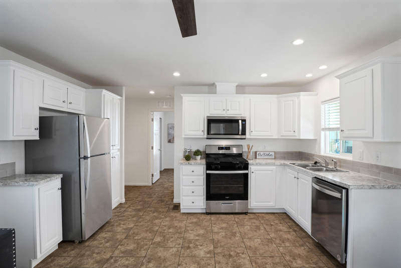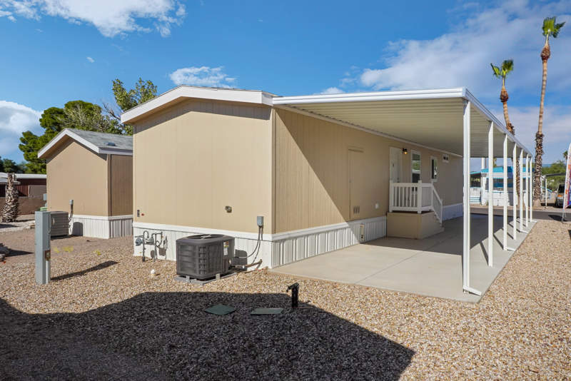 This 832 square foot manufactured home in Terra Vista community offers a cozy and modern living space with 2 bedrooms and 2 full bathrooms. The interior features a spacious master bedroom with an en suite bathroom, a great room perfect for entertaining guests, and a kitchen equipped with stainless steel appliances such as an oven, fridge, dishwasher, microwave, and garbage disposal. The home also includes a convenient washer/dryer hook up, central air conditioning, and a hot water heater for added comfort. Outside, there is a carport for parking and outdoor storage.